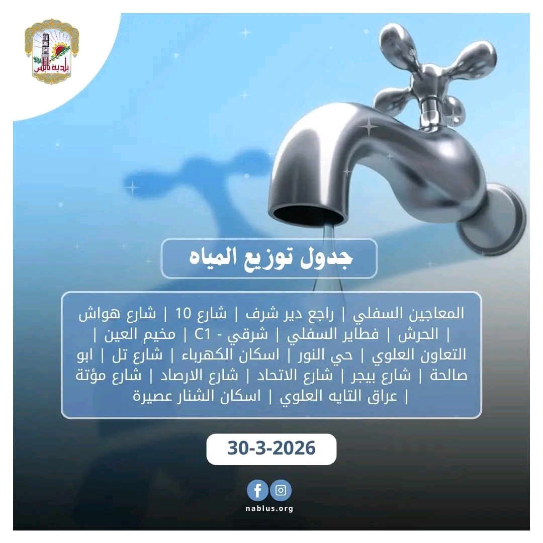 جدول توزيع المياه في نابلس لليوم الاثنين 30-3-2026