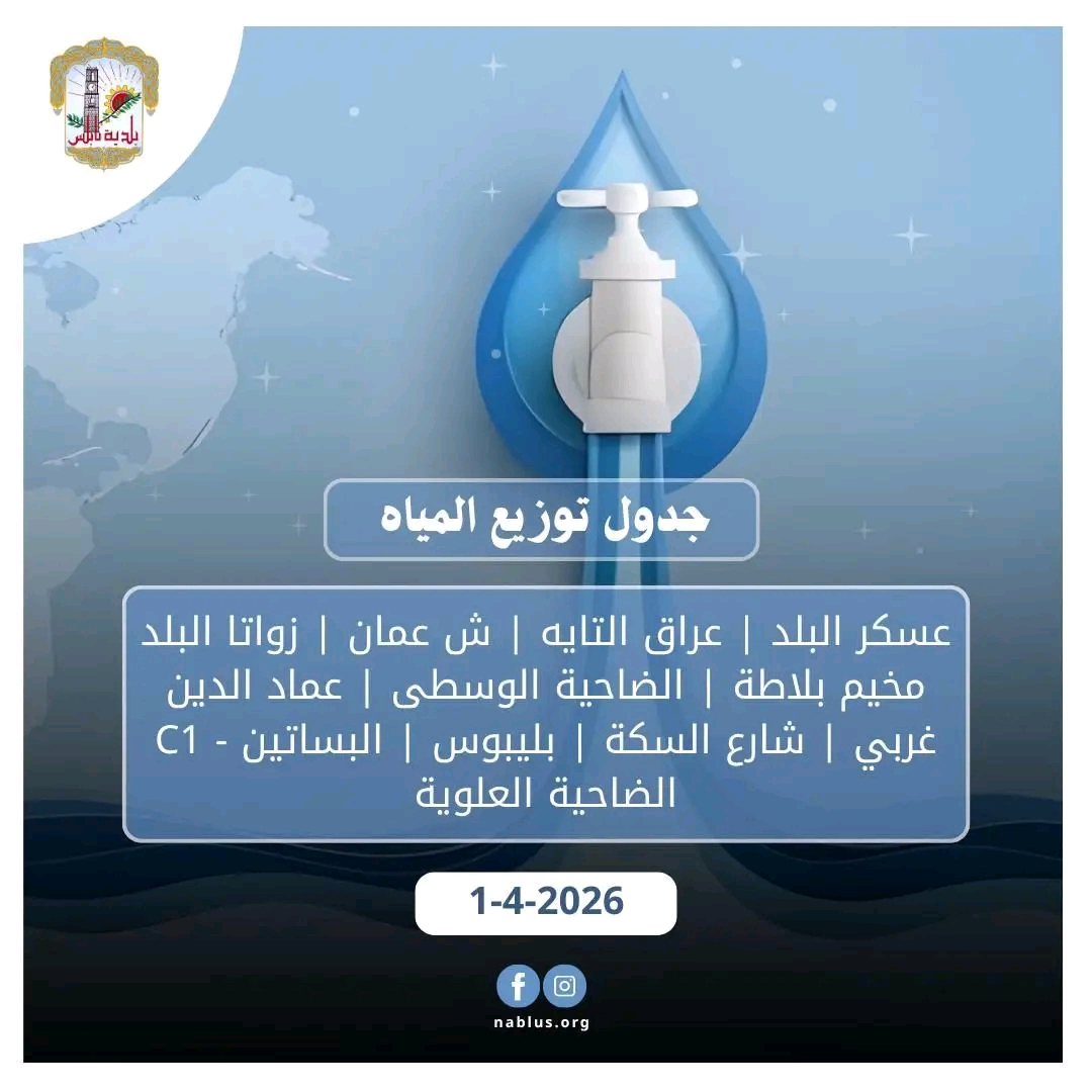 جدول توزيع المياه في نابلس لليوم الاربعاء 1_4_2026