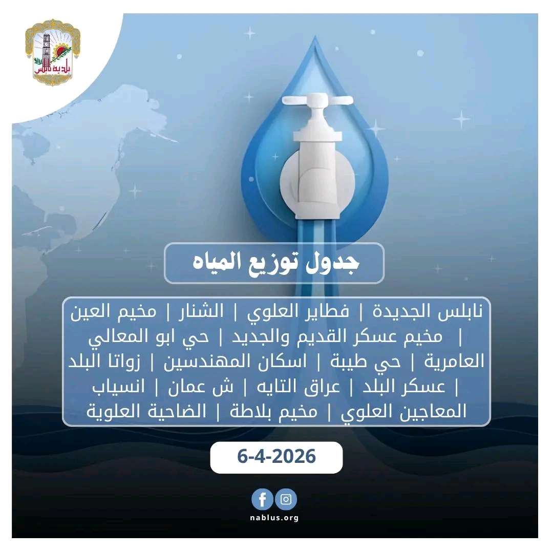 جدول توزيع المياه في نابلس لليوم الاثنين 6-4-2026