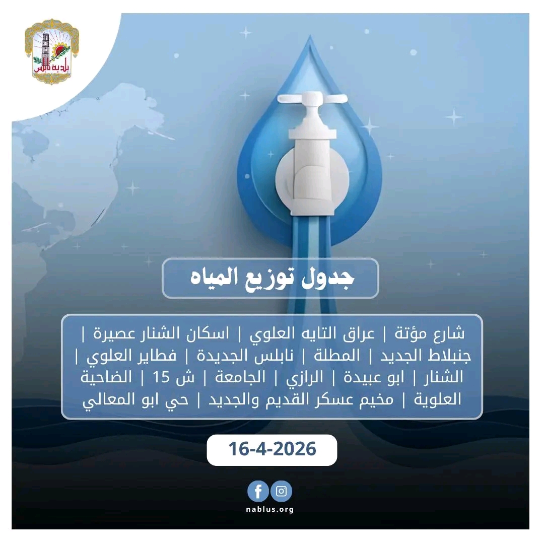 جدول توزيع المياه في نابلس لليوم الخميس 16-4-2026