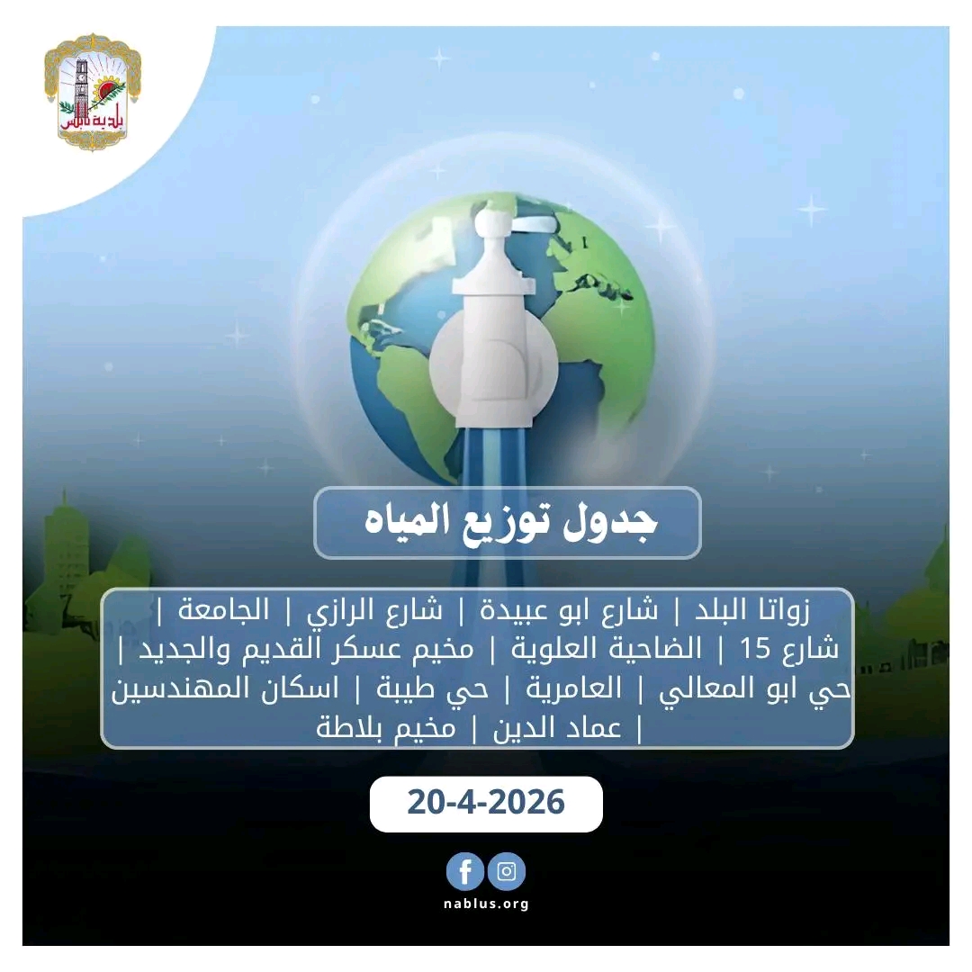 جدول توزيع المياه في نابلس لليوم الاثنين 20-4-2026