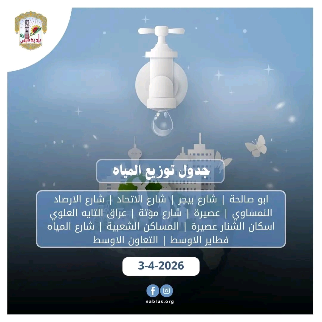 جدول توزيع المياه في نابلس لليوم الجمعة 3/4/2026