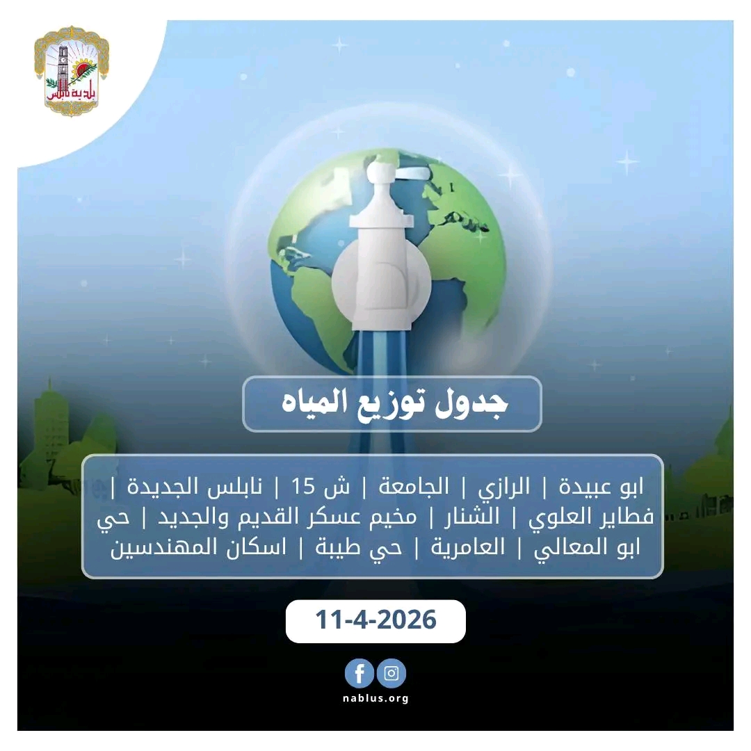 جدول توزيع المياه في نابلس لليوم السبت 11-4-2026