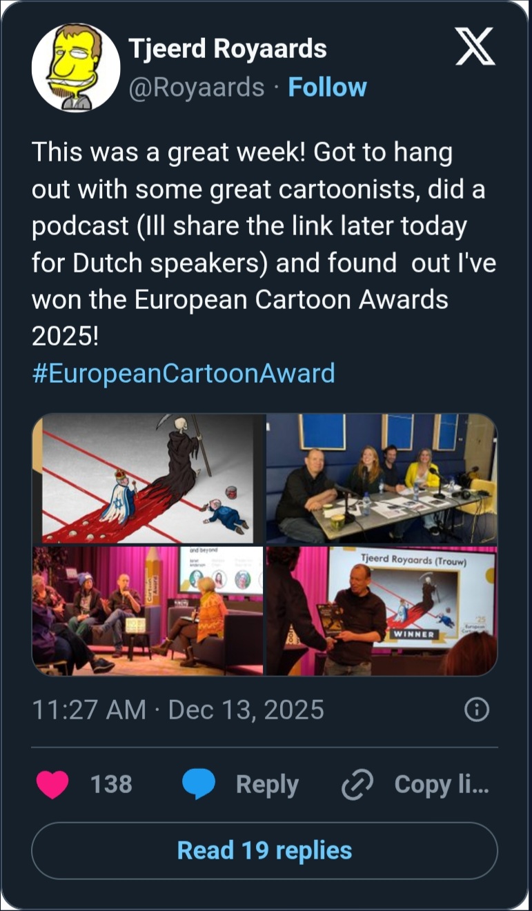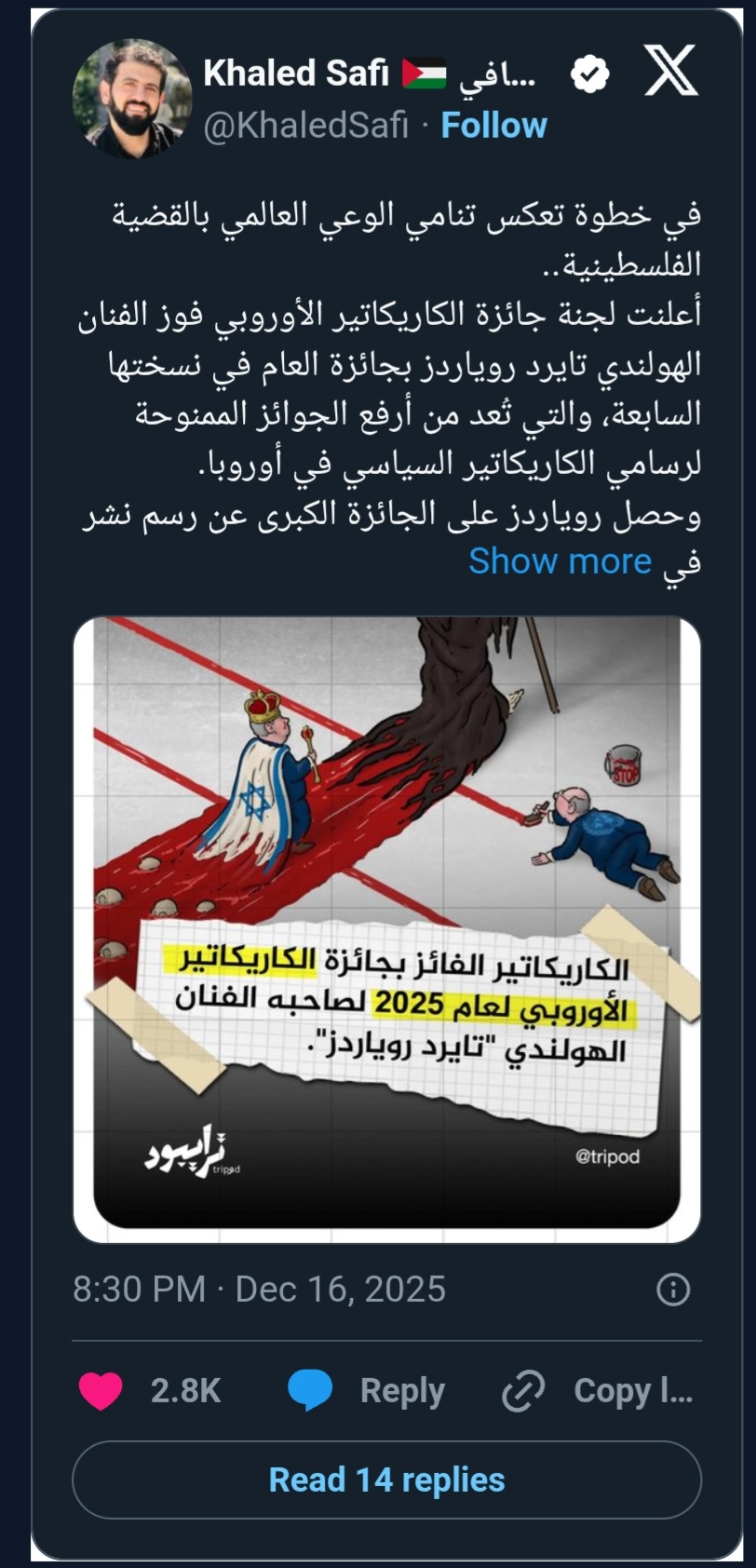 في خطوة لافتة تعكس اتساع رقعة التضامن الثقافي والفني مع القضية الفلسطينية داخل أوروبا، أعلنت لجنة جائزة الكاريكاتير الأوروبي فوز الفنان الهولندي تايرد روياردز بالجائزة الكبرى لعام 2025، في دورتها السابعة، وهي إحدى أبرز الجوائز الأوروبية المخصصة لفن الكاريكاتير السياسي والنقدي.